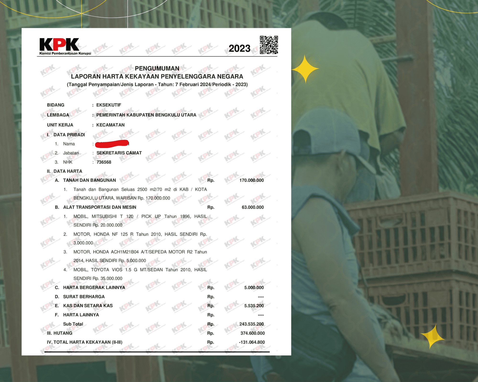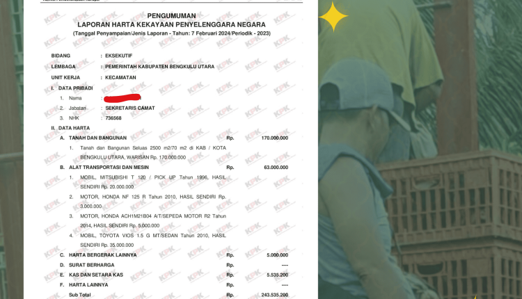 Di dalam LHKPN, pada Tahun 2023 oknum Sekcam melaporkan jumlah harta kekayaannya yakni Rp -131.064.800;. Namun, DPD LAKI Provinsi Bengkulu tidak mudah percaya begitu saja. Pasalnya, ada dugaan kalua oknum sekcam tersebut tidak tertib dalam melaporkan harta kekayaannya.