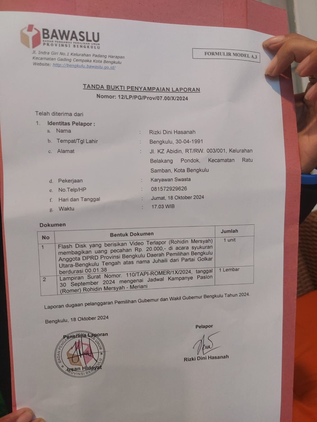 Selain itu, pelapor juga menyertakan bukti video saat Rohidin membagikan uang tersebut, yang diduga melanggar Pasal 66 ayat (1) dan (2) PKPU Nomor 13 Tahun 2024 tentang kampanye. (Tim)