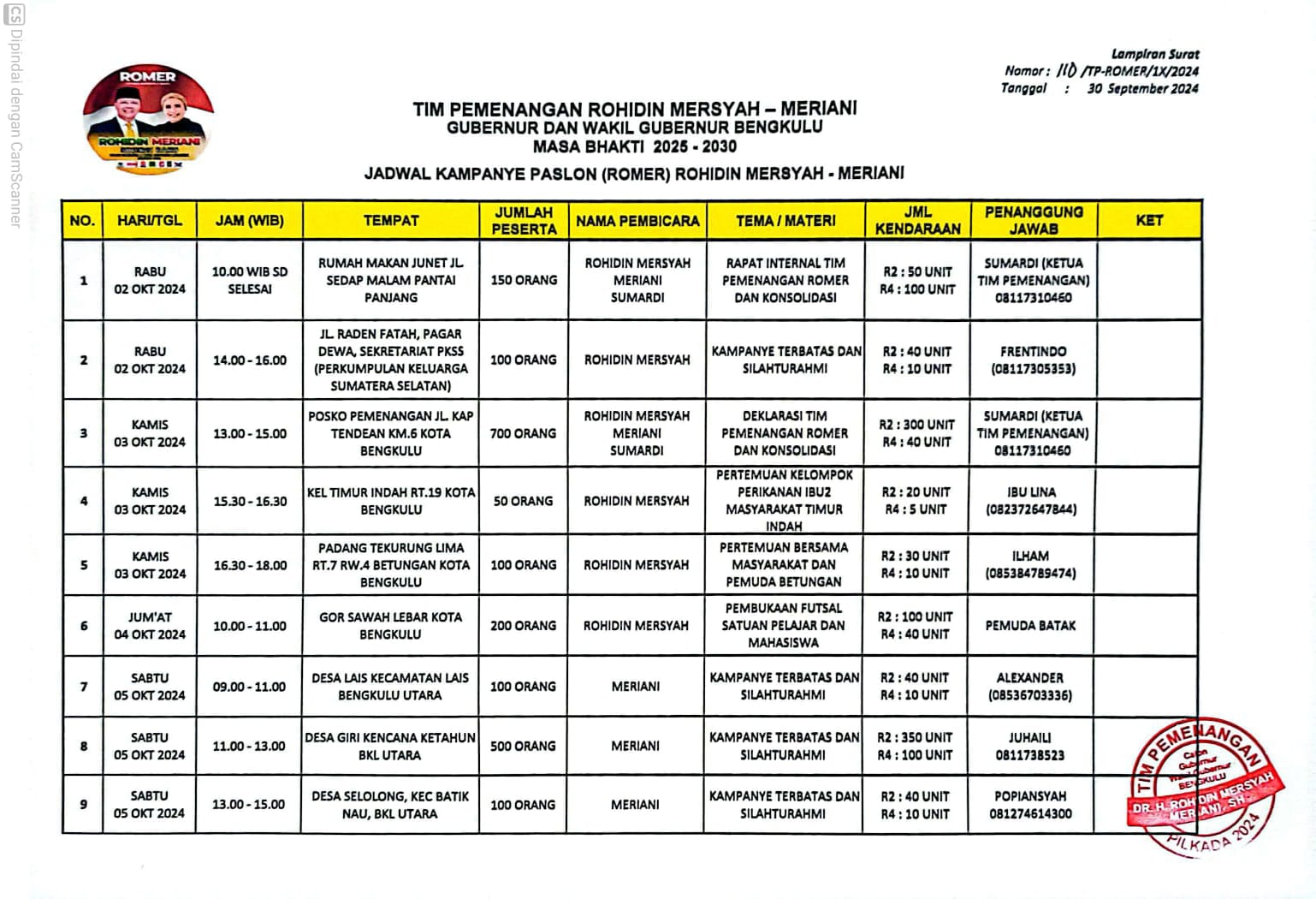 Dini juga menyertakan jadwal kampanye Rohidin dan menghadirkan dua orang saksi dalam pemeriksaan awal laporan tersebut.